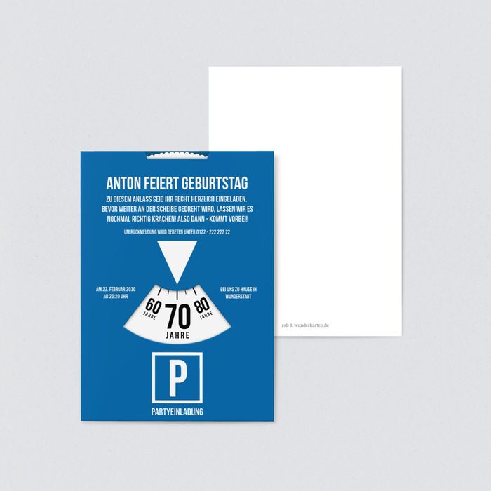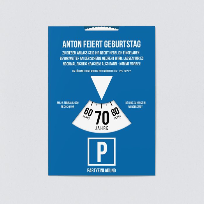 Startseite Geburtstagskarten Einladung runder Geburtstag Einladungskarten 70. Geburtstag Ihr Stil Ihr Format. Geburtstag im Stile einer Parkuhr Diese hübsche Geburtstagskarte hat das Design einer blauen Parkscheibe.